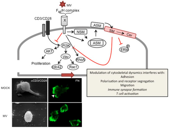 Indeed, MV exposure was found to sequentially activate NSM and ASM in T cells, and this accounted for the general loss of actin cytoskeletal dynamics in these cells [83] (Figure 3). Thus, pharmacological or genetic ablation of SMase activation essentially restored the ability of MV exposed T cells to polarize and spread on substrates, segregate receptors, migrate in response to stromal cell derived factor 1 (SDF-1) and to retain actin-based microvillar protrusions. In turn, exogenous ceramide accumulation caused loss of polarity and ezrin, yet not moesin phosphorylation on stimulation indicating that SMAse activation in general acts to regulate T cell activation by modulating cytoskeletal dynamics.