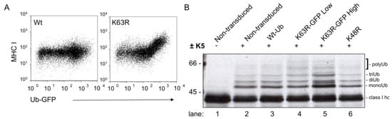 The role of Lys63 linked polyubiquitin chains in MHC I downregulation by K5 was established using a mutant ubiquitin, in which Lys63 was mutated to arginine (K63R) and rescued MHC I back to the cell surface as determined by flow cytometry []. Further biochemical analysis of this ‘rescued’ MHC I high population showed that instead of the predicted monoubiquitinated MHC I band, the MHC I in these cells showed an increase in polyubiquitinated MHC I (Figure 1B, lane 5). This result suggests (i) K5 can induce non-Lys63 linked polyubiquitin chains, and (ii) these polyubiquitin chains do not provide a signal for endocytosis. Therefore, polyubiquitination is not enough—the chain has to be the correct linkage—presumably for recognition by the correct UBD-containing protein(s).