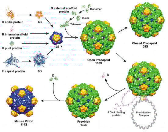 - Chen, D.H.; Baker, M.L.; Hryc, C.F.; Dimaio, F.; Jakana, J.; Wu, W.; Dougherty, M.; Haase-Pettingell, C.; Schmid, M.F.; Jiang, W.; Baker, D.; King, J.A.; Chiu, W. Structural basis for scaffolding-mediated assembly and maturation of a dsDNA virus. Proc. Natl. Acad. Sci. U. S. A. 2011, 108, 1355–1360. [Google Scholar] [CrossRef]