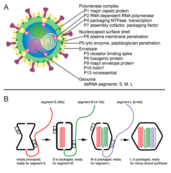 - Mindich, L. Packaging, replication and recombination of the segmented genome of bacteriophage f6 and its relatives. Virus Res. 2004, 101, 83–92. [Google Scholar] [CrossRef]
