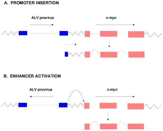 Insertion activation of c-myc in avian leukosis virus (ALV)-induced B-lymphomas. (A) Promoter insertion activation of c-myc as reported by Hayward et al. [42]. (B) Enhancer activation of c-myc (one of the configurations) reported by Payne et al. [43].