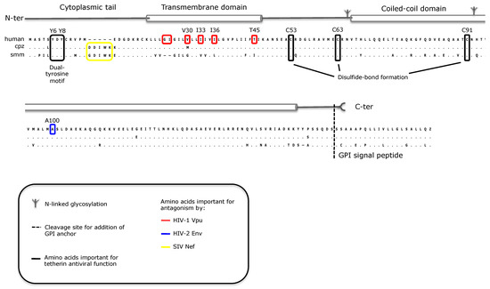 Features of tetherin. A schematic representation of the structural domains of tetherin is shown above an alignment of the human, chimpanzee (cpz) and sooty mangabey (smm) amino acid sequences. Black boxes around amino acids indicate regions important for the antiviral function of all three tetherin proteins. Red, blue and yellow boxes indicate amino acids important for the recognition and/or antagonism of tetherin by HIV-1 Vpu, HIV-2 Env and SIV Nef, respectively.