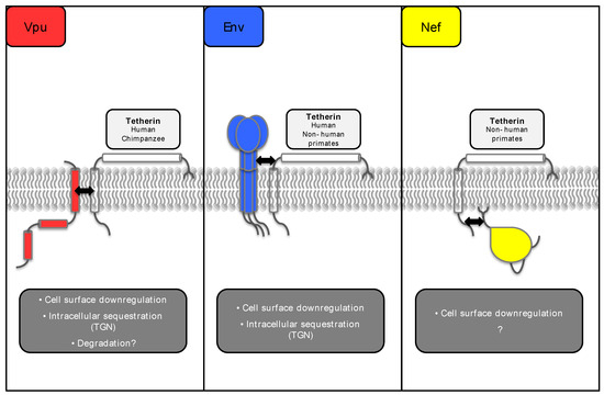 - Dube, M.; Roy, B.B.; Guiot-Guillain, P.; Mercier, J.; Binette, J.; Leung, G.; Cohen, E.A. Suppression of tetherin-restricting activity upon human immunodeficiency virus type 1 particle release correlates with localization of vpu in the trans-golgi network. J. Virol. 2009, 83, 4574–4590. [Google Scholar] [CrossRef] [PubMed]