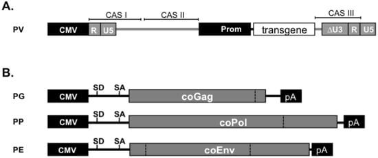 Third generation Prototype FV (PFV) vector system. Schematic outline of the third generation (A) transfer vector PV and (B) packaging expression vectors for codon-optimized (co) Gag (PG), coPol (PP), and coEnv (PE). CMV: cytomegalovirus immediate early promoter; R: LTR repeat region; U5: LTR unique 5' region; ∆U3: enhancer-promoter deleted LTR unique 3' region; Prom: internal heterologous promoter; CAS: cis-acting sequence; SD: splice donor; SA: splice acceptor.