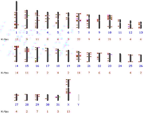 Distribution of EqERV-beta1 long terminal repeat (LTR) sequences over the horse chromosomes. NCBI Map Viewer output of a BLAST search of the horse (Equus caballus) genome (2N = 64) with the EqERV-beta1 LTR as query sequence. Chromosome numbers (blue) and hits per chromosome are indicated. Only 15 of 227 LTRs, distributed over 10 chromosomes, did not correspond to a full-length LTR or showed a lower sequence homology (generally 85–89%, indicated with a green or pink line), while most integrations were >95% homologous to the query sequence (indicated with a red line).