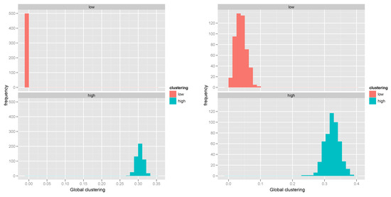 The distributions of the measured clustering coefficients is shown in Figure 3 and show that the simulated networks with high and low clustering for a given degree distribution are easily distinguished from one another. The Bernoulli networks with low clustering contain no triangles, so the clustering coefficient for each of these networks is zero, while for highly-clustered Bernoulli networks, clustering coefficients are in the range (0.28,0.33). For the power-law networks, the low clustered networks have clustering in the range (0.00,0.09) while the highly clustered networks have clustering in the range (0.24,0.38).