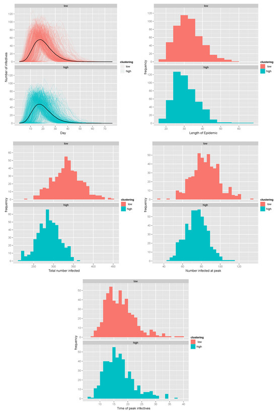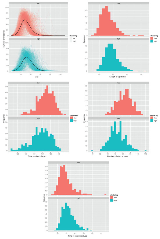 Figure 6 and Figure 7 show the corresponding distributions for networks with power-law degree distributions. Again, differences in the means between the two sets of statistics are apparent with the mean length of epidemic, total number infected and number infected at peak all lower in the epidemics on networks with high-clustering. The largest difference is found in the total number infected, where in the low-clustered networks, the range of the statistic is while it is just in the high-clustered networks. The primary cause here is due to the change in size of the largest connected component of the network. If we adjust for this by looking instead at the proportion of the giant component infected, the distributions again overlap almost completely with the range for the proportion infected in the low-clustered networks being and for the high-clustered networks.