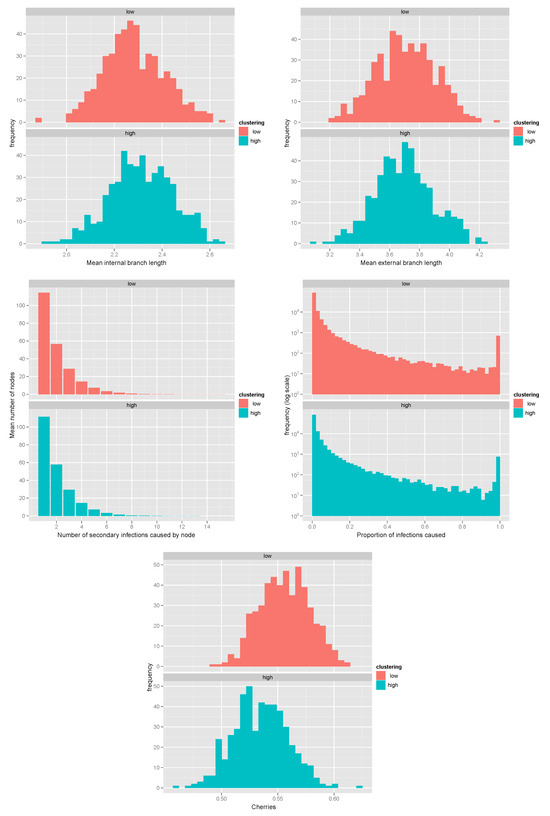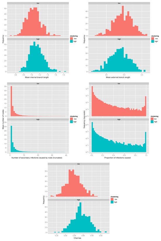 Figure 4 and Figure 5 show comparisons of summary statistics for networks with differing levels of clustering and Bernoulli degree distributions. The summaries show some differences between the outbreaks on the differently clustered networks. In particular, the outbreaks in the highly-clustered networks spread more slowly, on average, leading to marginally longer epidemics with fewer individuals infected at the peak of the outbreak, that occurs slightly later, than we see in outbreaks on the networks with low clustering. These mean effects are in line with the predictions of [22]. The variances of the measured statistics, however, are sufficiently large due to stochastic effects in the model that the ranges of the distributions overlap almost completely in most cases. Statistics derived from the transmission tree appear to add little information, with only the number of cherries differing in the mean.