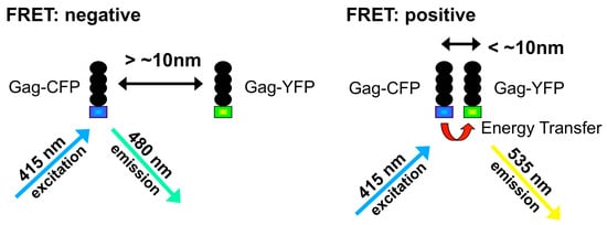 Fluorescence resonance energy transfer (FRET). FRET is used for monitoring intra- and inter-molecular interactions occurring on the nanometer scale. The transfer of excitation energy from a “donor” fluorophore (Gag-CFP) to an “acceptor’ fluorophore (Gag-YFP) is monitored. The donor molecule is excited with light at a wavelength that does not excite the acceptor molecule. At distances between donor and acceptor greater than approximately 5 nm, the excited donor molecule emits fluorescence at its characteristic wavelength. At distances below 5 nm, the excited donor molecule can transfer energy to the acceptor molecule, resulting in the acceptor fluorescing at a longer wavelength. In this example, a decrease in Gag-CFP signal, with a corresponding increase in Gag-YFP signal would indicate Gag-Gag interactions.