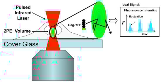 Fluorescence Fluctuation Spectroscopy (FFS). FFS monitors the fluorescence of single molecules moving through a laser excitation region. In FFS using two-photon excitation (2PE) a pulsed infrared laser is used to create a small excitation region (~1/1000th the volume of a cell) in the sample. The fluorophore is only excited in the focal region of the beam, as explained in the text. A single Gag-YFP molecule which either diffuses or is transported through the focal volume (inset) causes a burst in detected fluorescent intensity. By monitoring the characteristic timescale, amplitude, and frequency of the fluorescent fluctuations caused by single molecules moving through the focus, one can obtain information relating to protein mobility (duration of fluctuations), protein stoichiometry (amplitude of fluctuations), and concentration (frequency of fluctuations).