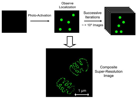 A second category of super-resolution involves the photoswitching or photoactivation of fluorophores, such that only a sparse few are fluorescing at any given time. If the fluorescing molecules are positioned such that there is only one fluorophore located within a diffraction-limited spot, their relative positions can be found with nanometer-scale resolution. In the next phase of the experiment, a different subset of fluorophores is “turned on” either through a photoswitching or photoactivation process, such that another distinct subset of fluorophores can be precisely located within the image. By switching fluorophores “on” and “off” through several iterations, a composite image with nanoscale resolution can be reconstructed from the multiple images of sparsely activated fluorophores. Super-resolution microscopy which relies on stochastic photoswitching of fluorophores is known by the name stochastic optical reconstruction microscopy (STORM) [135] (Figure 5). Super-resolution microscopy which relies on photoactivation of fluorophores is referred to as photoactivation localization microscopy (PALM) [136] or fluorescence photoactivation localization depletion (fPALM) [137].