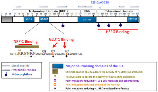 Localization of the neutralizing regions and the domains and residues involved in HSPGs, NRP-1 and GLUT1 binding within the HTLV-1 SU. The 90-94 motif identified as critical for direct NRP-1 binding [17] corresponds to a minimal neutralizing epitope [43], and contains the R94 residue required for HTLV-1 particle infectivity [44]. R94, as well as D106 and Y114 that mediate binding of the H1-RBD to target cells [3] are required for H1-RBD-mediated receptor interference [36]. The C-terminal domain of the SU contains the determinants for HSPG binding [13].