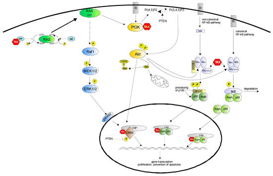 Akt regulates cellular survival by phosphorylation of substrates that directly or indirectly control the apoptotic machinery. For example, Akt induces the phosphorylation of Bad, a pro-apoptotic member of the Bcl-2 protein family; as a consequence, Bad dissociates from Bcl-XL and associates with cytoplasmic 14-3-3 proteins with consequent loss of apoptotic activity [77]. Akt also appears to both negatively regulate factors that promote the expression of apoptotic genes and positively regulate factors that induce survival genes. An example is Akt’s ability to activate the canonical and the non-canonical NF-κB pathway by triggering IκB phosphorylation and degradation, and by promoting the processing of p100 to p52, respectively [78,79]. Besides the NF-κB pathway, Akt phosphorylates and activates CREB mediated transcription, thus controlling expression of numerous “survival” genes [80,81] (Figure 1).