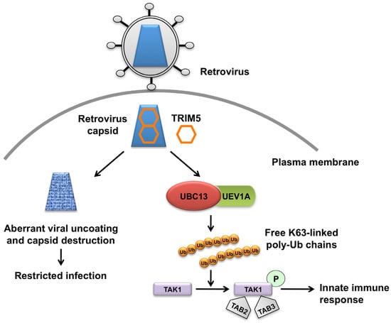 - Tareen, S.U.; Emerman, M. Human Trim5alpha has additional activities that are uncoupled from retroviral capsid recognition. Virology 2011, 409, 113–120. [Google Scholar] [CrossRef] [PubMed]