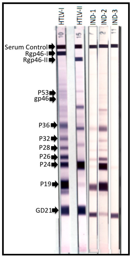 - Soldan, S.S.; Graf, M.D.; Waziri, A.; Flerlage, A.N.; Robinson, S.M.; Kawanishi, T.; Leist, T.P.; Lehky, T.J.; Levin, M.C.; Jacobson, S. HTLV-I/II seroindeterminate Western blot reactivity in a cohort of patients with neurological disease. J. Infect. Dis. 1999, 180, 685–694. [Google Scholar] [CrossRef] [PubMed]