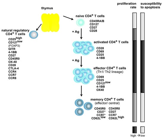 Naturally occurring CD4+ regulatory T cells (T reg) develop either in the thymus, or they arise from mature T cells recruited to the regulatory population in the periphery []. They comprise less than 10% of the CD4+ T cell pool in human blood. Functionally, T reg actively suppress activation of the immune system and prevent pathological self-reactivity, i.e., autoimmune disease []. Natural CD4+ T reg are mostly CD25 (IL2RA)high, CD127 (IL7R)low, and they express FOXP3 as well as other characteristic markers [,,]. Different T cell subsets do not only differ in their proliferation rates, but also in their susceptibility to apoptosis. T mem clones, for example, are fast-proliferating compared to naïve T cell clones []. Moreover, persisting T mem clones exhibit a low susceptibility to apoptosis after clearance of antigen as the survival protein BCL-2 (B-cell lymphoma 2) is upregulated [].