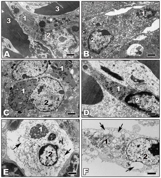 Transmission electron microscopy of ultrathin sections of tissues from animals experimentally infected with filoviruses. Tissues were fixed at day 5 or 6 p.i. (A) Ultrathin section of liver tissue from ZEBOV-infected rhesus monkey showing an infected macrophage. (B,C) Ultrathin sections of liver tissue from Marburg virus (MARV)-infected guinea pig. Shown are an infected macrophage (B) and an infected hepatocyte (C). (D) Ultrathin section of spleen tissue from ZEBOV-infected African green monkey showing an infected endothelial cell. (E) Ultrathin section of lymphatic node tissue from ZEBOV-infected African green monkey showing a necrotic infected macrophage. (F) Ultrathin section of a necrotic ZEBOV-infected Vero cell showing an infected macrophage. Arrows show vacuolization of endoplasmic reticulum cisterns in cells undergoing non-apoptotic cell death. 1—filovirus inclusions; 2—nucleus; 3—erythrocyte. Bars correspond to 2 µm.
