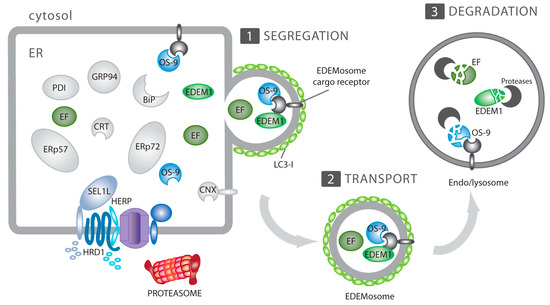 - Zuber, C.; Cormier, J.H.; Guhl, B.; Santimaria, R.; Hebert, D.N.; Roth, J. EDEM1 reveals a quality control vesicular transport pathway out of the endoplasmic reticulum not involving the COPII exit sites. Proc. Natl. Acad. Sci. U. S. A. 2007, 104, 4407–4412. [Google Scholar] [CrossRef]