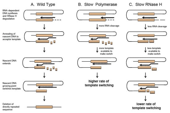The frequency of direct repeat deletion is not only dependent upon the template itself, but can also be influenced by factors that affect RT activity. Drugs or mutations that affect the balance between polymerization and/or RNase H activity of RT can influence template switching. The dynamic copy choice model shown in Figure 2 demonstrates that RTs with a slow polymerase will have a higher rate of template switching, while RTs with lower RNase H activity will have lower rate of template switching [11,36,37]. By slowing down polymerization, more efficient degradation of the template strand occurs behind the growing nascent DNA strand providing more time for hydrogen bonding to occur between the acceptor template and the nascent DNA. This results in an increase in template switching (Figure 2B). In the case where RNase H activity is reduced, less nascent DNA is available to hydrogen bond with the template strand to facilitate a template switch, resulting in a reduced frequency of template switching (Figure 2C).