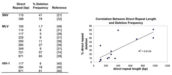 Relationship Between Direct Repeat Size and Deletion Frequency. Left: Summary table showing the reported deletion frequencies of direct repeats from MLV, SNV and HIV-1; right: correlation between the size of the direct repeat and the frequency of deletion.