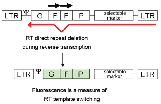 Direct repeat deletion is highly precise and accurately deletes repetitive sequences. Because of this phenomenon, direct repeats can be used to make informative vectors for laboratory use to study recombination by analyzing intra- and intermolecular template switching. Gene sequences from selectable drug markers such as neomycin, herpes simplex thymidine kinase gene, and lacZ can be duplicated to create direct repeats, and used to determine if viral infection has taken place. Even more informative is the use of fluorescent gene sequences, such as the green fluorescent protein (GFP), to detect infection of MLV [36] or HIV-1 [37] in cell lines (Figure 4).