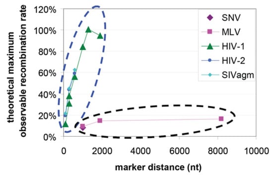 Retroviral Recombination Rates. X-axis, nucleotide distances between genetic markers; Y-axis, percent of theoretical maximum observable recombination rate [79]. Measured recombination rates from lentiviruses (dotted oval in blue) and gammretroviruses (dotted oval in black).