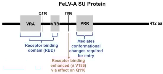 Two proteins, the surface glycoprotein (SU) and the transmembrane protein (TM), are generated from the envelope gene of gammaretroviruses. SU resides on the particle surface, anchored to the TM protein, and is thereby positioned to make contact with the host cell surface and to interact directly with the receptor. The SU protein of gammaretroviruses contains three highly variable, functional domains required for receptor interaction and entry (Figure 5). Variable region A (VRA) is the primary determinant of receptor binding, and thus of host range, for FeLV and related retroviruses while variable region B (VRB) is a secondary determinant required for efficient infection [22,23,24,25,26,27,28]. An adjacent proline-rich region (PRR) mediates conformational changes required for virus entry [29]. These motifs comprise what has been termed the receptor binding domain (RBD). Outside of the conventionally defined RBD, additional binding determinants have been identified throughout the SU protein [24,30,31]. Entry of FeLV occurs after binding of the RBD to the host cell receptor, followed by conformational changes that ultimately lead to fusion of the viral and cellular envelopes. Thus, the SU protein acts as the initial determinant of tissue tropism, and the affinity of its interaction with host cell receptor may influence the rate of virus spread during infection.