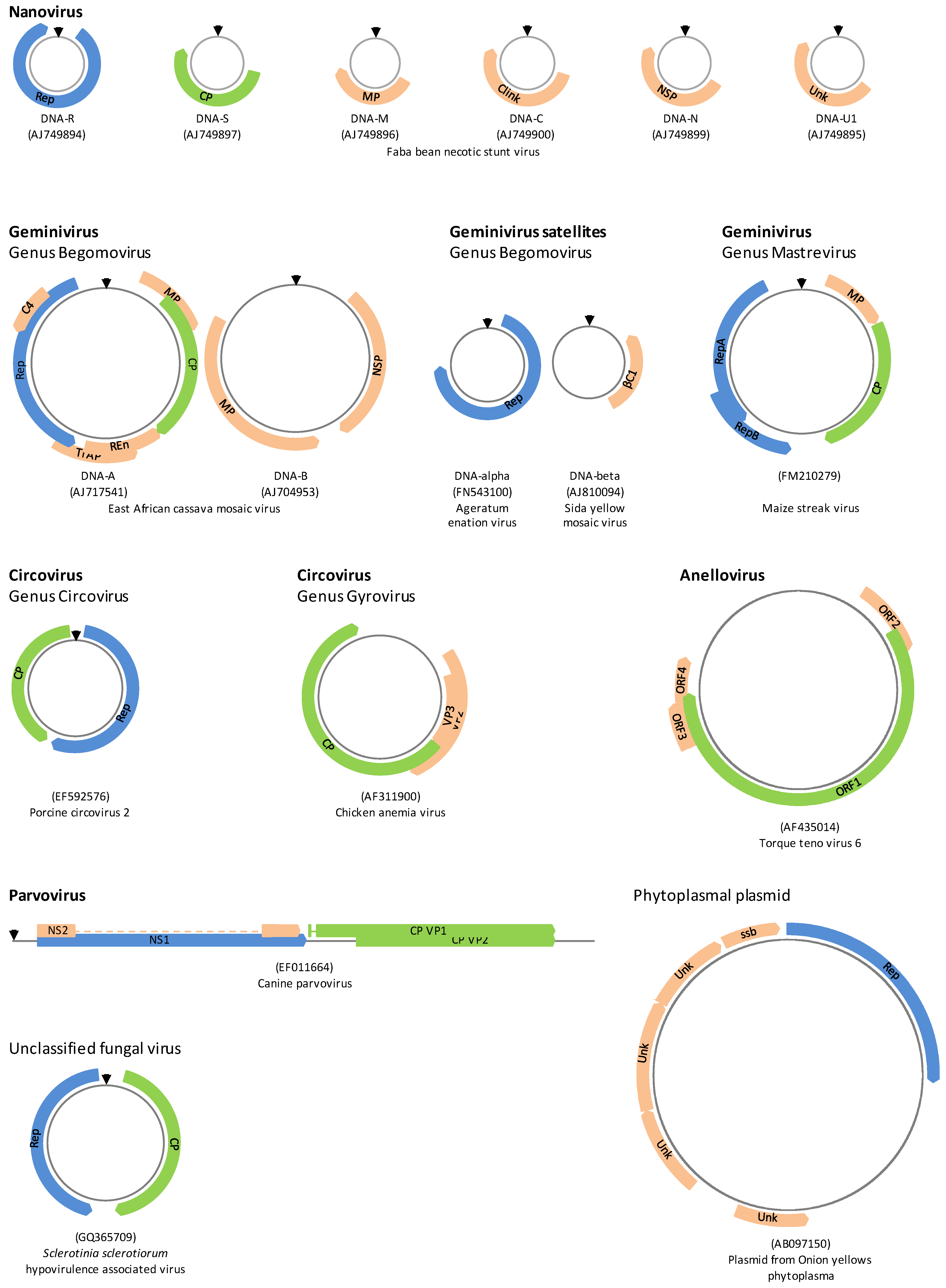 - Krupovic, M.; Ravantti, J.J.; Bamford, D.H. Geminiviruses: A tale of a plasmid becoming a virus. BMC Evol. Biol. 2009, 9, 112. [Google Scholar] [CrossRef] [PubMed]