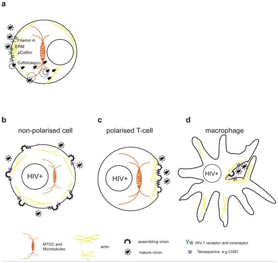 In HIV-1 infected macrophages and DCs, assembly was observed on internal compartments that were subsequently identified as tetraspanin-rich sequestered plasma membrane domains [63,64,65,66,67]. The disruption of the actin cytoskeleton in infected macrophages decreased intracellular accumulation of HIV-1, but had no effect on the overall release [56].