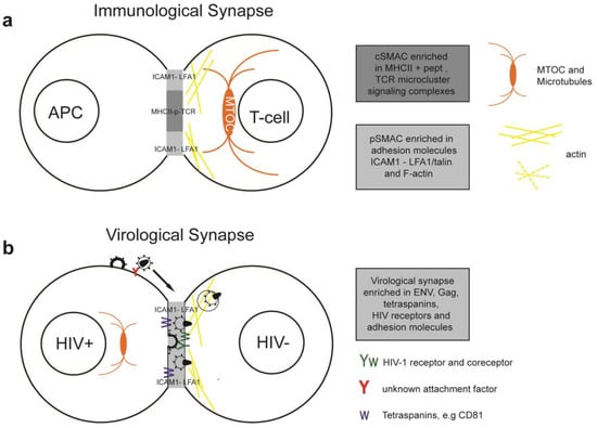 - Vasiliver-Shamis, G.; Dustin, M.L.; Hioe, C.E. HIV-1 virological synapse is not simply a copycat of the immunological synapse. Viruses 2010, 2, 1239–1260. [Google Scholar] [CrossRef]