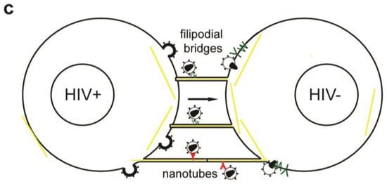 Besides VS actin-containing membrane extensions, filopodial bridges, nanotubes and tunneling nanotubes have been implicated in cell-to-cell transfer of HIV-1 (Figure 2c) and other retroviruses [80,91,92,93]. Filopodial bridges extend from uninfected to infected epithelial cells, are stabilized through Env-receptor interaction and mediate viral transfer through retrograde actin flow towards the uninfected cell [91]. Nanotubes, on the other hand, are formed upon transient contact between T cells and connect cells over several cell lengths in curved paths. HIV-1 infection did not affect the frequency nor the direction of intercellular connections through nanotubes, but infection of target cells occurred in a receptor-dependent manner [92]. Tunneling nanotubes, however, are induced by HIV-1 infection of macrophages and contain HIV-1 particles [93].
