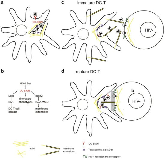 - Hodges, A.; Sharrocks, K.; Edelmann, M.; Baban, D.; Moris, A.; Schwartz, O.; Drakesmith, H.; Davies, K.; Kessler, B.; McMichael, A.; et al. Activation of the lectin DC-SIGN induces an immature dendritic cell phenotype triggering Rho-GTPasease activity required for HIV-1 replication. Nat. Immunol. 2007, 8, 569–577. [Google Scholar] [CrossRef]