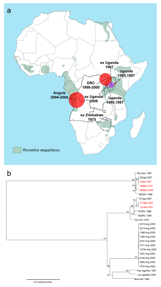 Geographic distribution and phylogenetic analysis of Marburg virus. (a) Location of Marburg virus (MARV) infections (circle sizes correspond to reported number of MARV cases) and distribution of the Egyptian fruit bat (Rousettus aegyptiacus) in Africa (www.iucnredlist.org). Outbreak locations (red circles) and sites of initial infection for exported cases of Marburg virus disease (MVD) (purple circles) are shown. (b) Bayesian phylogenetic analysis of full-length MARV genomes isolated from humans and bats. Numbers at the nodes represent posterior probability values. MARV isolates obtained from bats are shown in red. Analysis was performed by S. Carroll and J. Towner, Viral Special Pathogens Branch, CDC Atlanta, GA and represents an updated version of the analysis shown in [22].