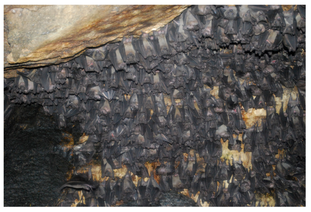 MVD is considered a zoonotic disease that is thought to persist in a healthy reservoir host in the endemic areas in Africa. Humans and NHPs are spillover hosts and show a high rate of fatal disease outcomes. Several large-scale attempts to identify the natural host of filovirus infection throughout sub-Saharan Africa had been undertaken in the years since filoviruses first emerged with frustratingly little success [28,29,30,31]. Consistent with ecologic niche modeling of outbreaks and epidemiological patterns, isolated cases have suggested that EBOV is endemic in the rain forests of central and western Africa while MARV is more prevalent in open, dry areas of eastern, south-central Africa [32,33]. Almost all of the primary infections of natural MVD outbreaks so far have been linked to human entry into caves inhabited by bats (e.g., cave visitors, mine workers) (Table 1). Thus, bats have long been suspected to play an important role in the transmission cycle of the disease [31,32,34]. In 2007, evidence was detected for MARV infection of the common Egyptian fruit bat (Rousettus aegyptiacus) [35,36] (Figure 2), and MARV was isolated from healthy infected R. aegyptiacus bats caught in the same year in Uganda [22]. The bats were collected in Kitaka cave around the same time as human infections occurred that had been linked to the cave (Table 1 and see above, 1. Epidemiology). Genomic analysis of the few isolates of MARV acquired from bats showed that the sequences matched closely to the MARV genomes isolated from patient samples (Figure 1b). This was also the case for partial MARV sequences isolated from bats inhabiting the Goroumbwa mine in the DRC that was suspected to be the major location for several independent spillover events to gold miners between 1998 and 2000. The bat MARV sequences were closely related to the distinct isolates that had been reported during these outbreaks in humans [36].
