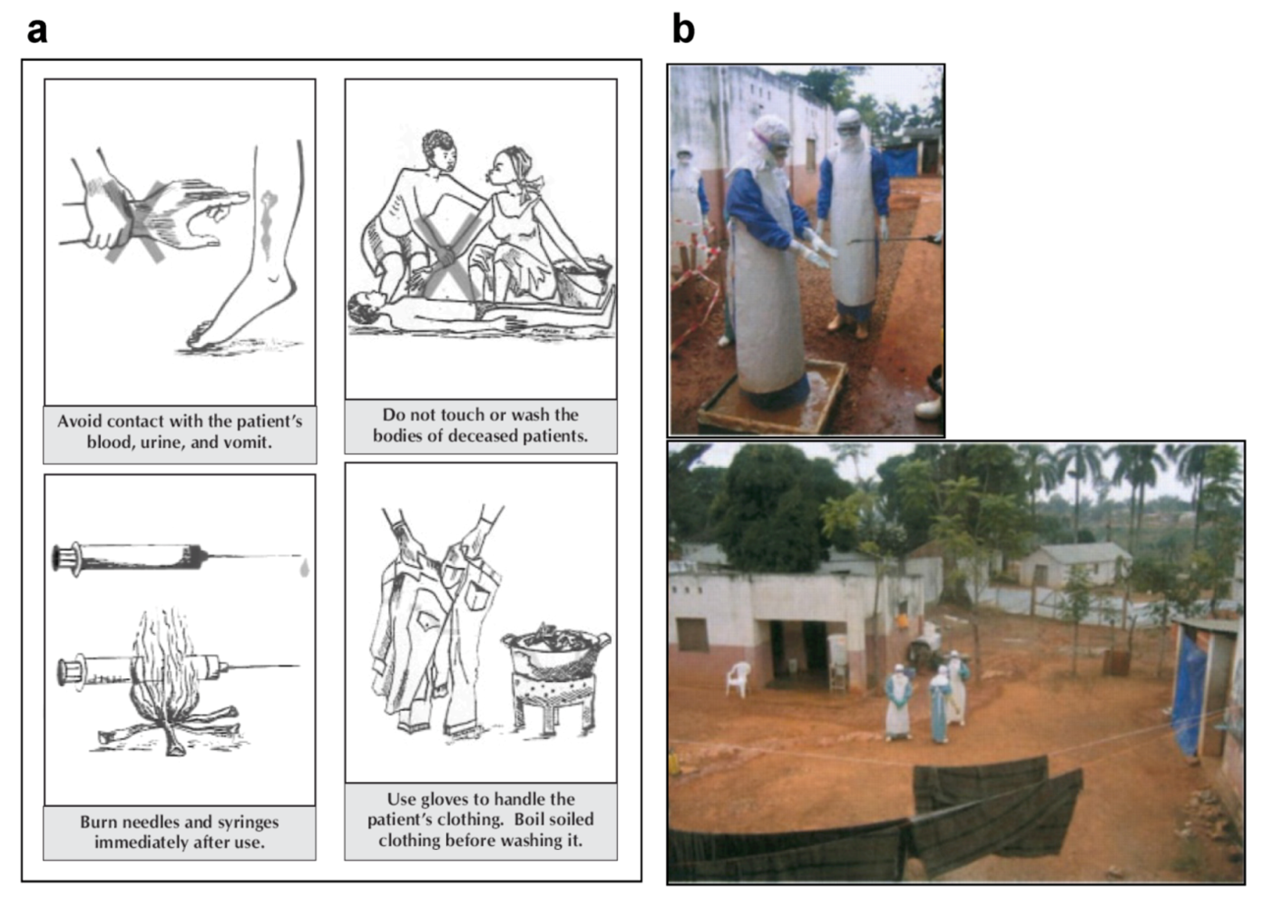 Marburg virus disease outbreak control. (a) Signs used to educate the local population in outbreak areas. Picture taken from [57]. (b) Pictures of the MVD outbreak in Angola, 2005. Above, nurse being sprayed with chlorine while leaving the isolation ward. This illustrates the protective clothing worn by nursing staff. Below, view showing a section of the isolation ward. The ward for confirmed MARV patients is on the left. The solid plastic sheeting used for the outer wall is shown in the distance. Figure and legend modified from [54].