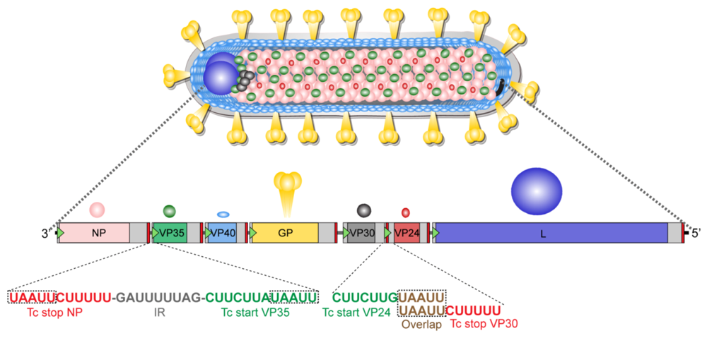 Marburg virion structure and genome organization. Above, schematic of Marburg virion. Below, structure of the MARV genome with transcription signals. The colors of the open reading frames correspond to the colors of the viral proteins. Untranslated regions of the different genes are shown as light grey boxes; intergenic regions (IR) are shown as dark grey lines and the leader and trailer of the genome are colored in black. Transcription start signals (Tc start) are represented by green triangles, while transcription stop signals (Tc stop) are shown as red bars. The sequence of two gene borders (NP/VP35 and VP30/VP24) is shown in 3’ to 5’ orientation, as it occurs in the negative sense RNA genome (MARV Musoke, GenBank accession number: NC_001608). The gene border between VP30 and VP24 contains overlapping transcription signals, with the start signal of VP24 upstream of the stop signal of VP30.