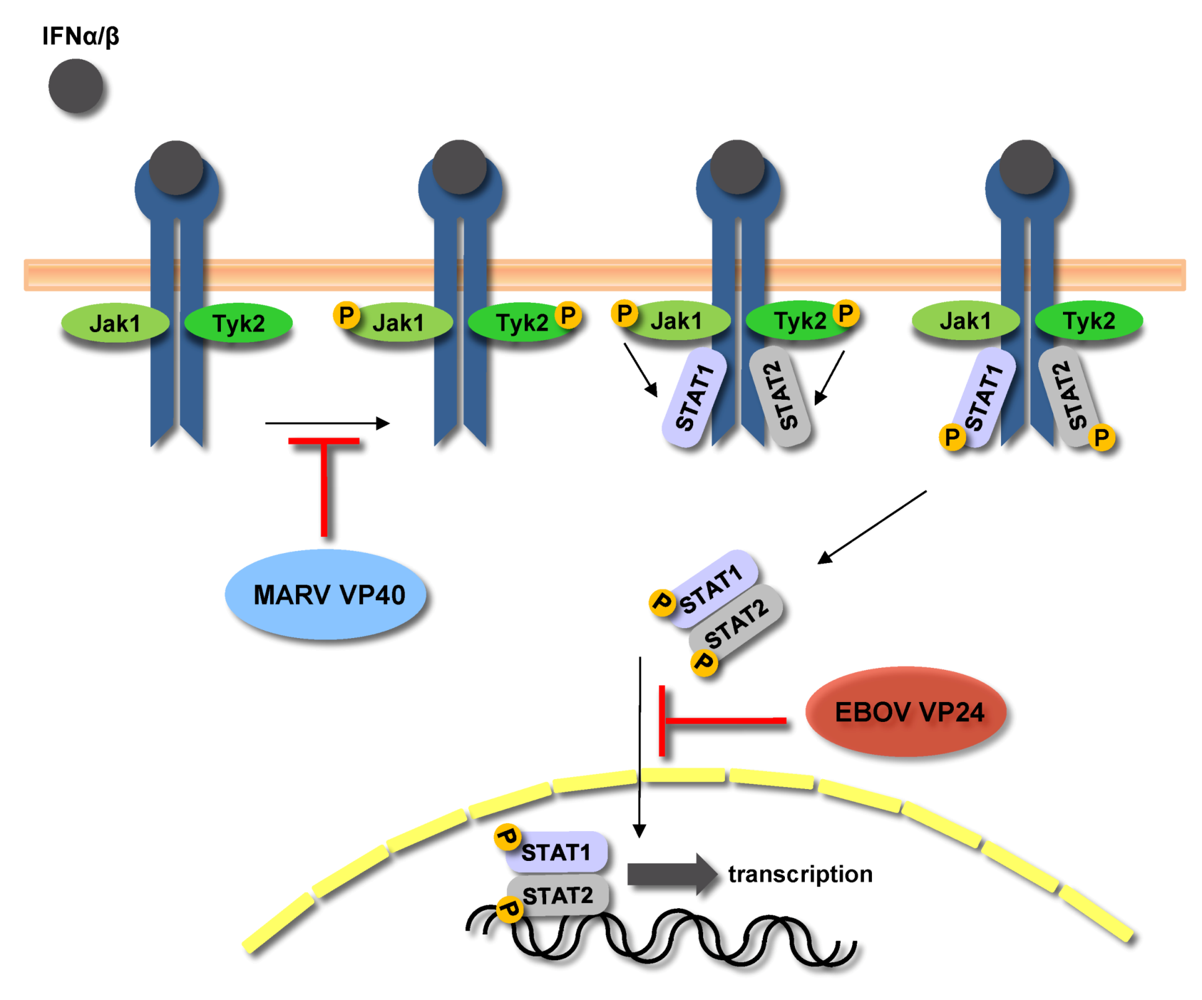 - Watanabe, S.; Noda, T.; Halfmann, P.; Jasenosky, L.; Kawaoka, Y. Ebola virus (EBOV) VP24 inhibits transcription and replication of the EBOV genome. J. Infect. Dis. 2007, 196, S284–S290. [Google Scholar] [CrossRef]
