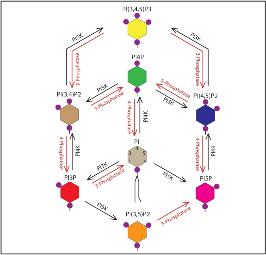 Phosphoinositides (PIPs), Kinases and Phosphatases. Schematic representation of phosphatidylinositol, the seven PIP varieties, kinases and phosphatases involved. Kinases are represented in black, phosphatases in red.