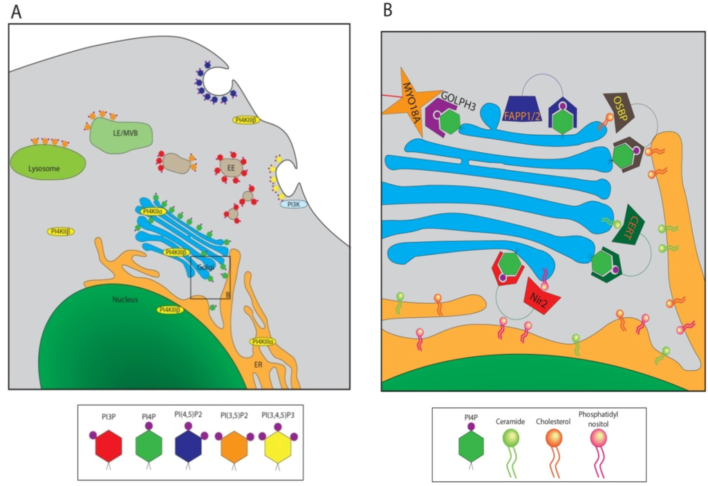 Cellular Localizations of Various Phosphoinositides. (A) Diagram of a typical cell, highlighting the locations of various PIPs in different cellular membranes. EE: Early endosome; LE/MVB: Late endosome/multi-vesicular body. Some PI kinases are also given in their cellular locations. PI4Ks are in yellow ovals, PI3K in cyan; (B) Close-up of panel B in Figure 2A. PI4P binding proteins at the Golgi/TGN are localized, as well as the lipids or other proteins to which they bind. Lipid transfer proteins (LTPs) Nir2, CERT, and OSBP are shown shuttling their preferred lipid cargo from the ER; PI (pink), ceramide (green), and cholesterol (orange), respectively.