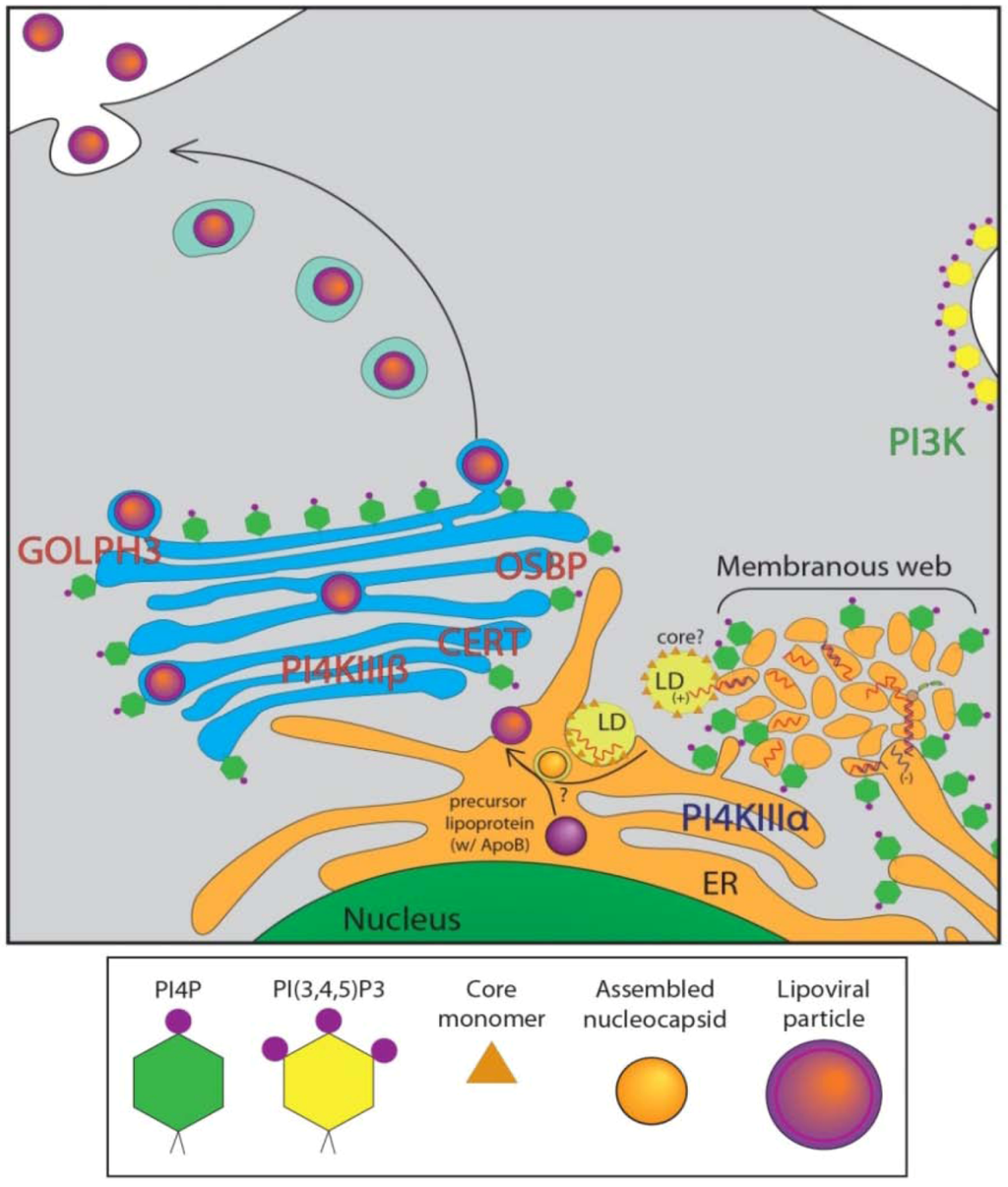HCV Infected Cellular Distribution of PIPs, Binding Proteins. Diagram of HCV-infected cell showing enrichment of PI4P at the ER and membranous web, with model of potential HCV assembly pathway in conjunction with lipid droplets (LDs) and ApoB precursor lipoprotein [7]. HCV RNA is produced in replication complexes at membranous web structures juxtaposed to ER, and in close association with LDs. Viral assembly site is unknown, but viral particles may associate with ApoB precursor lipoproteins. Infectious viral particles are then likely trafficked through the Golgi and released at the PM. PIP associated proteins known to affect the HCV lifecycle are highlighted. Akt pathway-PI3K (green text). Replication-PI4KIIIα (blue text). Secretion-PI4KIIIβ, OSBP, CERT, GOLPH3 (red text).