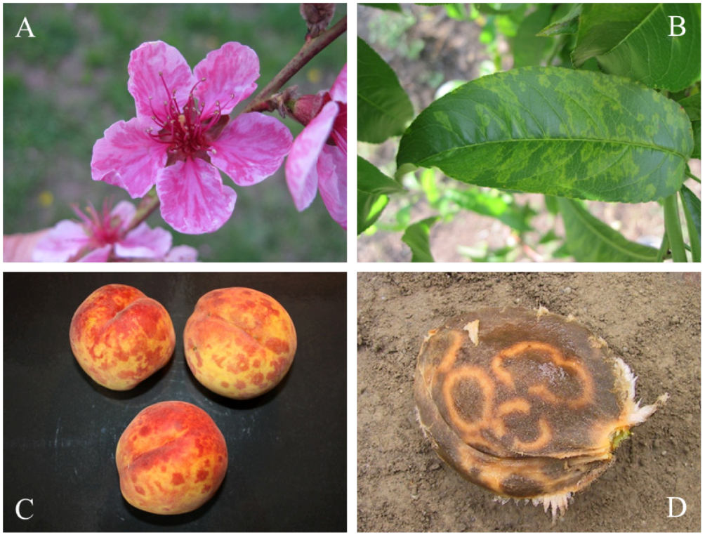 | Prunus persica L. (Batsch)cv. GF305 | vein necrosis, malformation of leaves | [352,353] |