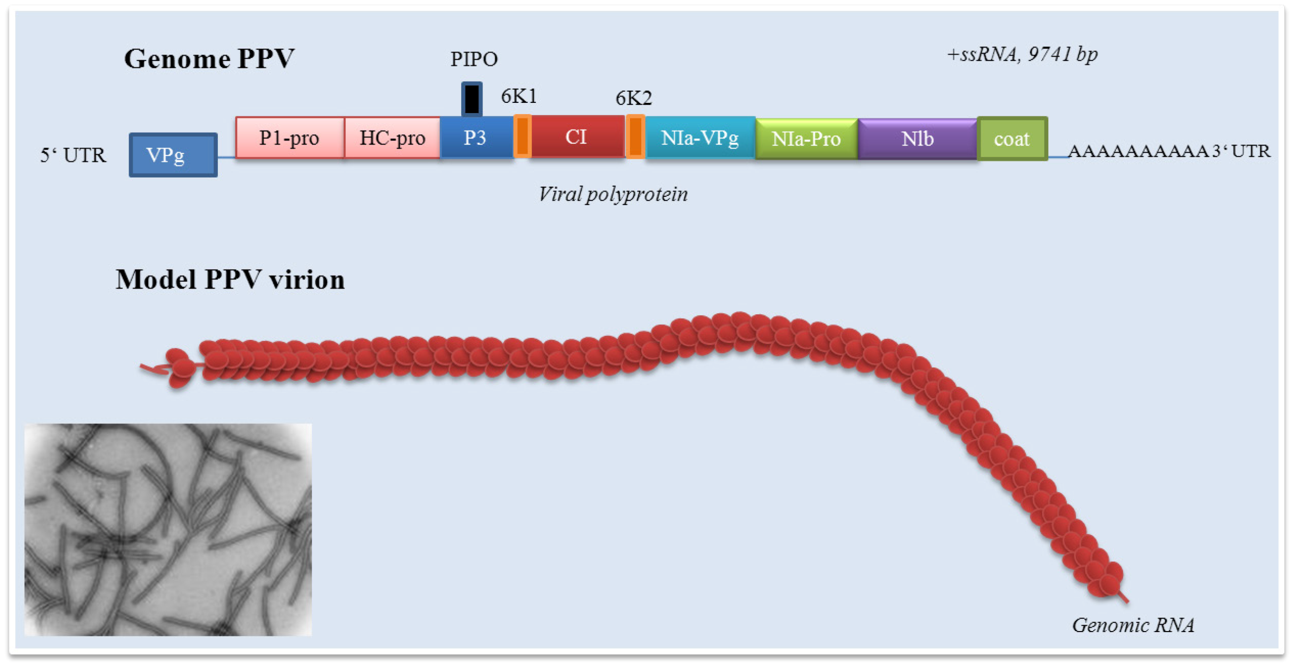PPV virions are long, flexuous and rod-shaped, approximately 750 nm (660-750 nm) in length and 15 nm (12.5 -20 nm) in width [294]. PPV as a member of Potyviridae has the structure typical for all potyviruses with exception of Bymovirus. The molecule of ssRNA is of positive polarity. The RNA of PPV has a VPg protein linked to its 5´end and a long poly(A) tail, which is heterogenous in its size at its 3´end [295]. In the case of an aphid non-transmissible PPV, excluding a 3´terminal poly(A) sequence the ssRNA is 9741 nucleotides in length. The 3´noncoding region is 220 nucleotides in length without the poly(A) tail [296]. PPV genome contains a long open reading frame starting at the first AUG codon, nucleotide 36, that is translated upon infection, starting at the second AUG codon as nucleotide 147, into a large polyprotein of 355.5 kDa [70,295,297]. There are still unanswered questions about initiation of potyviruses translation via recognition of the specific viral sequences [125,298]. Because potyviruses including PPV have relatively short 5´non-coding regions with a low content of cytosine and guanine, they avoid a stable secondary structures and lack nonfunctional intraleader opening reading frames [299,300]. Cap-independent internal initiation of translation has been proposed for four members of the genus Potyvirus [301,302]. Work of Simón-Buela et al. presents different in vitro and in vivo evidence of cap-independent leaky scanning as the mechanism of translation initiation of PPV genomic RNA [303]. Originated polyprotein precursor is co- and post- translationally cleaved by three virus-encoded proteinases into 11 mature proteins – P1, HCpro, P3, P3N-PIPO, 6K1, CI, 6K2, NIa (respectively VPg and NIa-Pro), NIb and CP. CP protein of about 36 kDa forms helically arranged “coat”. Similarly to other potyviruses, the PPV P1 proteinase represents together with P3/6K1, 6K2, NIa/VPg and N-terminal domain of CP highly variable protein [285,304,305]. This variability enables the determination of PPV isolates and their further characterization [285,304,305,306]. The untranslated region of PPV consists of 147 nucleotides, starting with four adenine residues. It seems that intact 5´end is not essential for PPV replication. PPV 5´ untranslated region that is essential for virus replication is confined to the first 35 residues. Deletion of a long sequence between nucleotide 39 and 145 did not affect the rate of infection and viral accumulation, but affected process of pathogenesis [307,308].