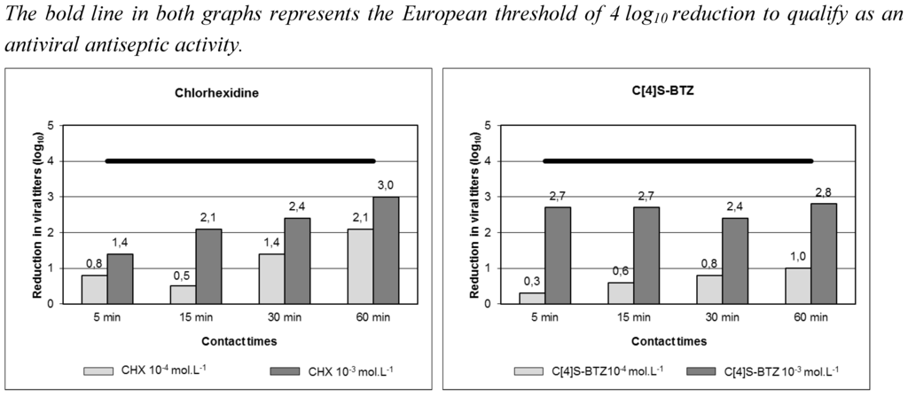The second study concerned the antiseptic anti-HCoV 229E activity of two calixarenic compounds, i.e. the tetra-para-sulfonato-calix[4]arene (C[4]S) and the 1,3-bis(bithiazolyl)-tetra-para-sulfonato-calix[4]arene (C[4]S-BTZ) [130,131]. These molecules were attractive targets at first because they did not show any cytotoxicity. Then, the C[4]S-BTZ showed an equivalent, and even better, activity than that of chlorhexidine. Indeed, its activity reached almost 3 log10 reduction in viral titers from 5 min of contact time (Figure 1b). Some further studies are needed, but calixarenes appear as interesting candidates to be new antiseptics-disinfectants.