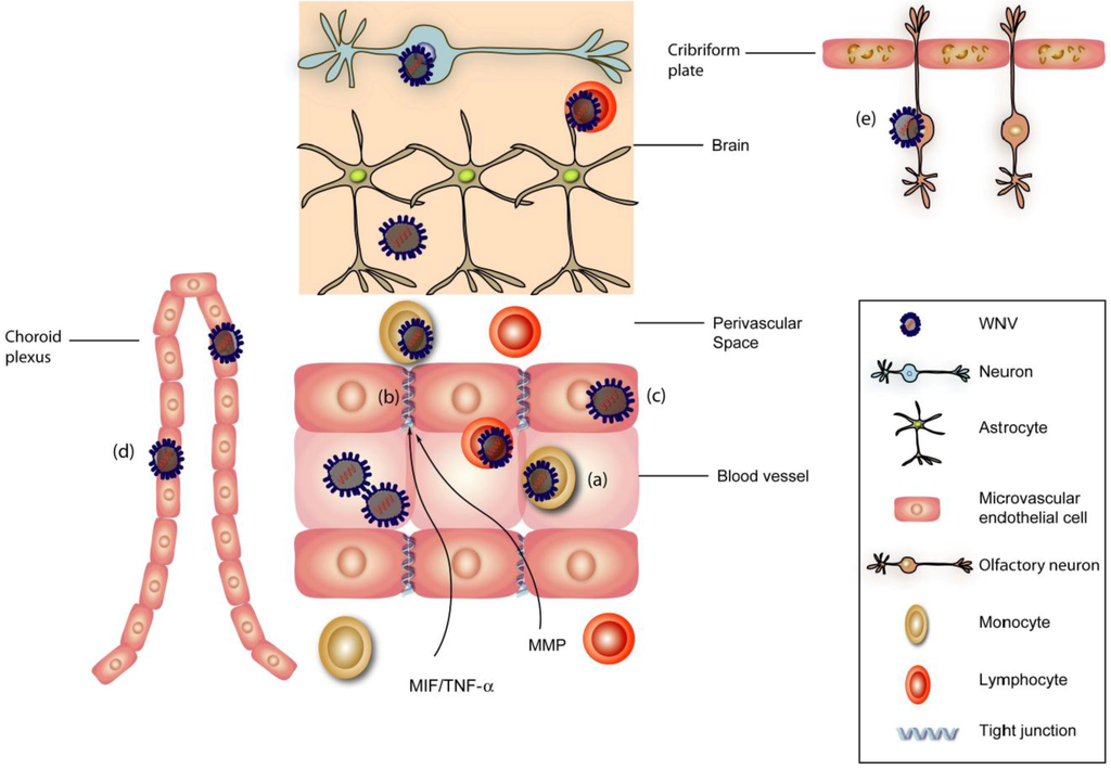 Mechanism of neuroinvasion of West Nile virus (WNV). WNV may enter the central nervous system (CNS) via multiple mechanisms including axonal retrograde transport along peripheral neurons into the spinal cord or hematogenous transport across the blood-brain barrier (BBB). Spinal cord entry is believed to result in interneuron spread to motor neuron cell bodies within the anterior horn of the spinal cord and lead to flaccid paralysis. The possible routes of virus entry across the BBB include (a) “Trojan horse” model; intracellular transport within macrophages or neutrophils, (b) loss of integrity of the BBB; cytokine-mediated (TNF-α, MIF) or matrix metalloproteinases disruption of tight junctions and basement membranes; (c) direct infection of brain microvascular endothelial cells with basolateral spread of the virus; (d) infection of choroid plexus epithelial cells; or (e) direct infection of olfactory neurons adjacent to the cribriform plate.