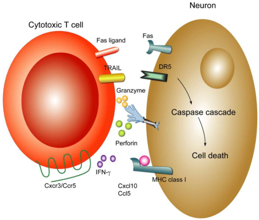 Mechanisms of CD8+ T cell clearance in the CNS. CD8+ T cells control WNV infection in the CNS through multiple mechanisms. Infected neurons upregulate surface expression of MHC class I molecules. Antigen-specific CD8+ T cells recognize infected neurons via class I MHC and processed viral peptides and trigger cell death of target cells through perforin, Fas-Fas ligand, or TRAIL-dependent pathways. Perforin-mediated control of infected neurons occurs through the granzyme-dependent granule exocytosis pathway, which results in apoptosis of infected neuron. Interactions between Fas on infected neurons and FasL on CD8+ T cells leads to programmed cell death of neurons through caspase-dependent pathways. CD8+ T cells also utilize TRAIL to restrict WNV infection in neurons. TRAIL binds to DR5 on neurons, which can have a direct antiviral effect against flaviviruses [125] or result in targeted apoptosis. Activated CD8+ T cell also produce IFN-γ, which can induce genes with antiviral effect.