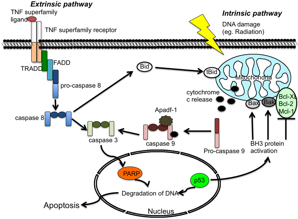 Apoptosis, also known as programmed cell death, plays an important role in development, cellular homeostasis and the pathophysiology of many diseases [6]. Apoptosis helps to eliminate damaged cells and also contributes to the elimination of virus-infected cells [7]. If inappropriately up- or down-regulated, apoptosis can also contribute to various diseases such as autoimmunity and cancer [8]. Two major classic apoptotic pathways have been identified: the extrinsic pathway, triggered by the engagement of “death receptors”, and the intrinsic pathway, which responds to a variety of stress signals (for example, radiation) by triggering the release of intracellular signals that promote cell death [9,10,11].