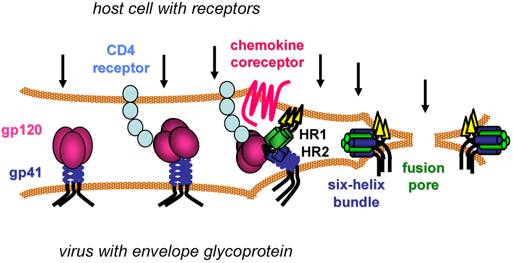 Figure 1. Model of HIV entry. CD4 receptors and chemokine coreceptors are shown on the host cell. The gp120 surface subunit and gp41 transmembrane subunit of the HIV envelope glycoprotein are shown on viral membrane (envelope). After gp120 binds to CD4, the envelope glycoprotein undergoes conformational changes that facilitate gp120 interaction with the chemokine co-receptor. Additional conformational changes in the gp41 transmembrane subunit transiently expose two heptad-repeat domains (HR1 and HR2) that subsequently self-assemble to form a six-helix bundle structure. Formation of several gp41 six-helix bundles bring the host and viral membranes together for fusion, while several six‑helix bundles likely coalesce to form a fusion pore that allows the viral core to pass into the host cell cytoplasm. Arrows indicate potential steps in the entry process for inhibition.