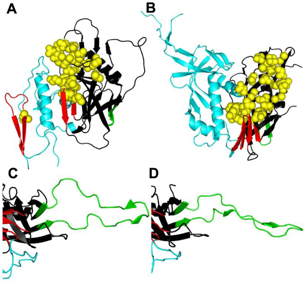 Figure 2. Conformational changes in gp120. (A) Unliganded simian immunodeficiency virus (SIV) gp120 core [32]. (B) HIV gp120 core complexed with CD4/48d antigen-binding fragment (Fab) [40] reveal significant conformational changes when CD4 is bound. (C) V3 in CD4/X5 Fab gp120 core complex [41]. (D) V3 in CD4/tyrosine-sulfated 412d Fab gp120 core complex [42] reveals potential conformational changes that can occur when V3 binds to CCR5. Resistance mutations to entry inhibitors often occur in the CD4 binding site (yellow spheres) and in the V3 domain (green), but can also be found elsewhere in gp120 and gp41. Resistance mutations may alter conformational changes in Env in ways that go beyond the classical resistance mechanism of excluding the inhibitor from its binding site. The inner domain is colored cyan, the outer domain is black, the bridging sheet is red, the V3 loop (or stem in (A) and (B)) is green, and residues contacting CD4 are represented as spheres and colored yellow. The PDB accession codes that used were 2BF1 (A), 3JWD (B), 2B4C (C), and 2QAD (D). For clarity only gp120 is displayed.