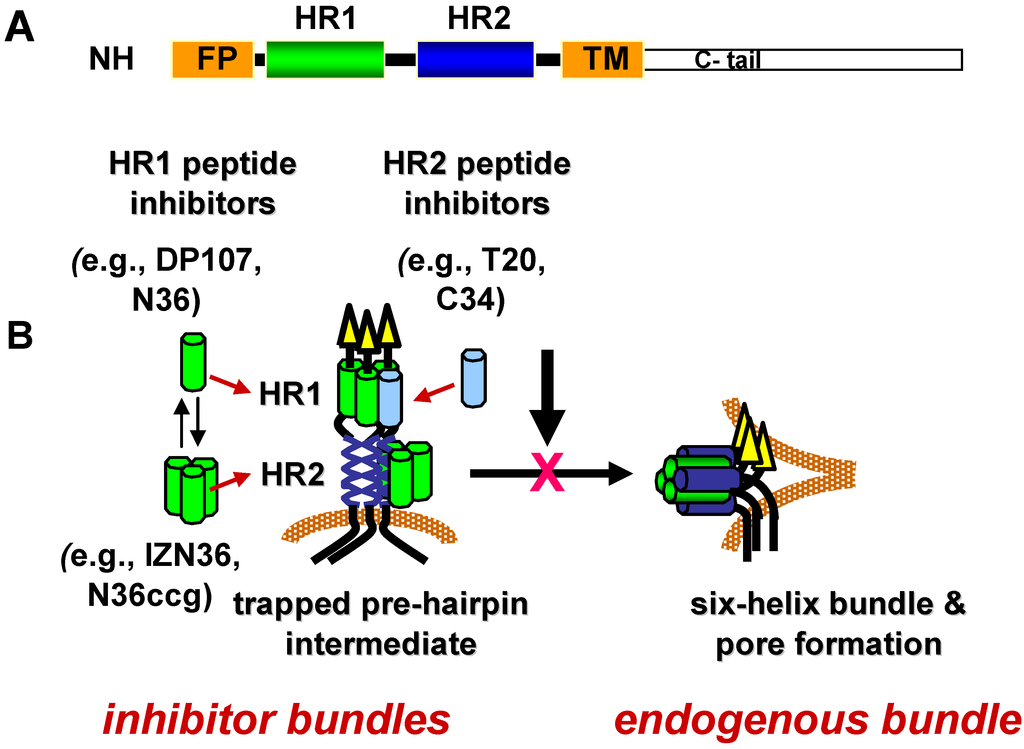 Figure 3. gp41 heptad-repeat domains and fusion inhibitors. (A) Schematic diagram of gp41 domains. NH2 indicates N-terminus. FP indicates fusion peptide. HR1 is the N‑terminal heptad repeat. HR2 is the C-terminal heptad repeat. TM indicates transmembrane domain. C-tail indicates the cytoplasmic domain. (B) Model of dominant negative inhibition by heptad-repeat peptides. HR1 and HR2 peptides mimic the HR1 and HR2 segments, respectively, in the gp41 ectodomain. During receptor-induced conformational changes in the envelope glycoprotein, the HR1 and HR2 become more exposed as the fusion peptide (FP) inserts into the host cell membrane. This conformation is referred to as the pre-hairpin fusion intermediate. Before the HR1 and HR2 continue to self assemble to form the six-helix bundle (endogenous bundle), the HR1 or HR2 peptides gain access to the endogenous HR1 or HR2 to form a peptide-gp41 six-helix bundle (inhibitor bundle). In this dominant negative mechanism of inhibition, the peptide inhibitor interrupts formation of the endogenous bundle and pore formation needed for promoting membrane fusion between the virus and host cell membrane.