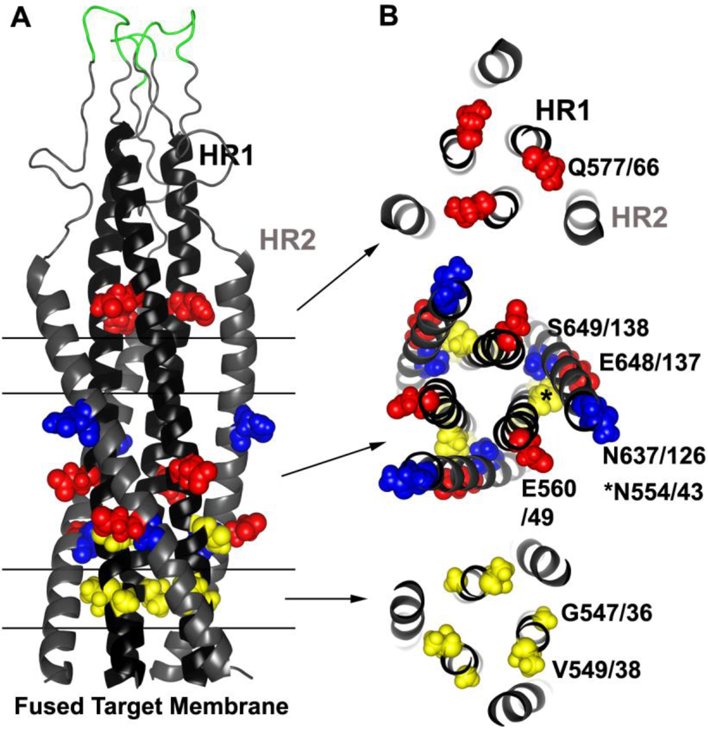 Figure 4. Common resistance mutations selected by HR1 and HR2 peptide inhibitors. (A) Side view model of the 6HB derived from the SIV gp41-ectodomain NMR structure [250,251] (Protein Data Bank entry 1IF3). Parallel lines and arrows indicate the relevant cross sections in (B). T20 and other early-generation HR2 peptides tend to select for residues in the HR1. Sites of three common resistance mutations occurring in HR1 (G547/36, V549/38 and N554/43, gp160/gp41 numbering according to the HXB2 clone) are highlighted in yellow spheres. Two compensatory mutations in HR2 that frequently appear at two locations (N637/126 and S649/138) are indicted by blue spheres. HR1‑peptide inhibitors, which may target HR2 and/or HR1, commonly select for mutations at three positions (Q577/66, E560/49 and E648/137) and are indicated by red spheres. Residues adjacent to the disulfide loop (green) can also confer resistance to certain small molecule inhibitors. Residues in yellow tend to destabilize the bundle, and residues in red and blue tend to stabilize the bundle.